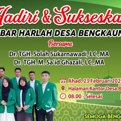 Perayaan Hari Lahir (HARLAH) Desa Bengkaung Ke-10 yang dikemas dalam bentuk "TABLIG AKBAR" yang pertama kali dilaksanakan pada Tahun 2020 ini akan digelar pada hari Ahad, 23 Februari 2020 Pukul 08.00 Wita sampai selesai di Halaman Kantor Desa Bengkaung, InsyaAlloh akan dihadiri oleh: Bapak Bupati Lombok Barat, H. Fauzan Khalid, S.Ag., M.Si dengan Pengisi TABLIG AKBAR oleh: